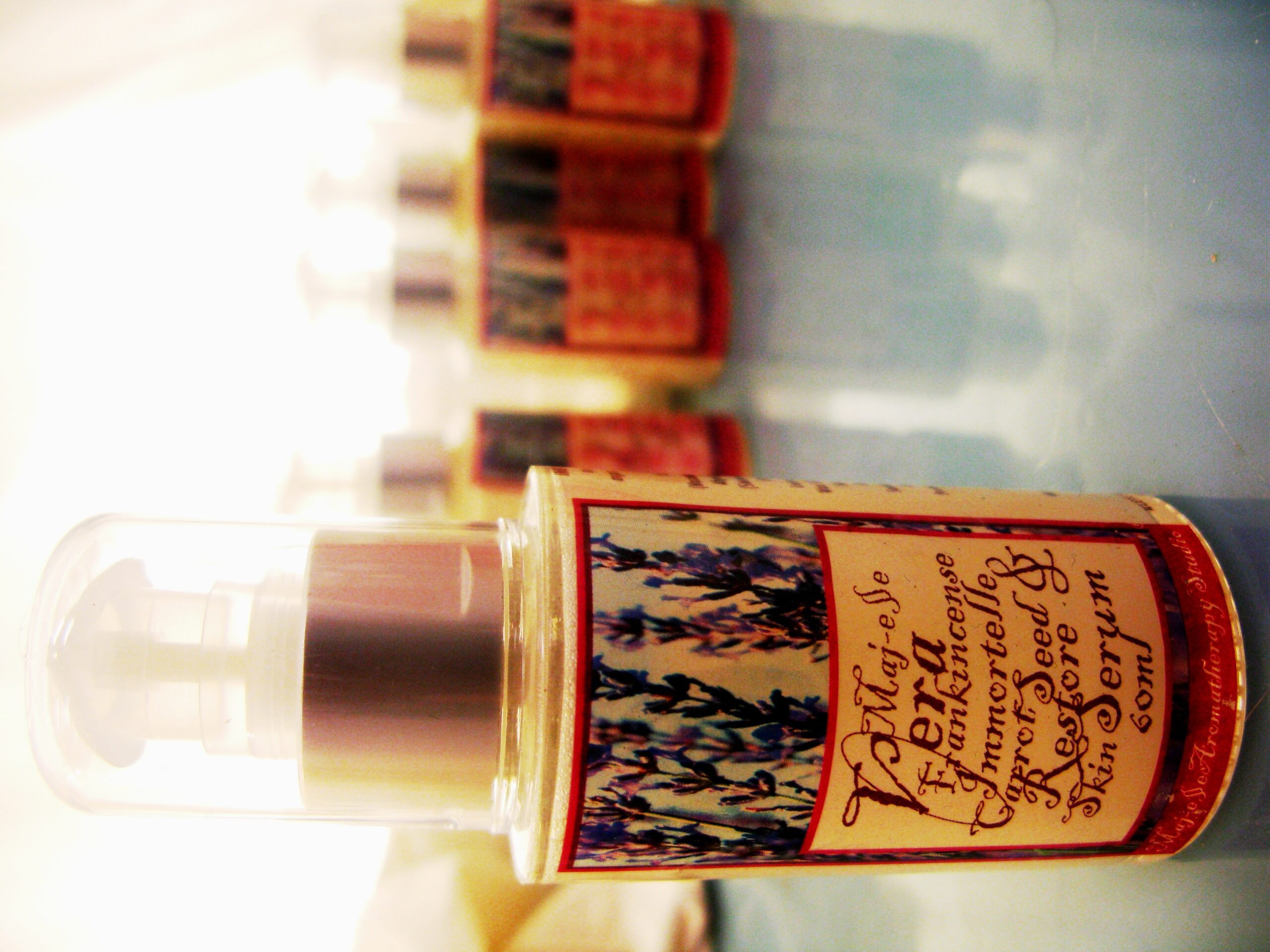 Ingredients: Lavender Hydrosol (Lavandula angustifolia v. Bee & Maillette) •, Immortelle Hydrosol (Helichrysum angustifolium)•, Hypericum Hydrosol (Hypericum perforatum)•, Glycerine*, Macadamia Nut Oil*, Australian Golden Jojoba Oil, Crambe Abyssinica Seed Oil (and) Phytosterols, Rosehip Oil, Olive Squalane, Leuconostoc/Radish Root Ferment Filtrate, Cetearyl Olivate (and) Sorbitan Olivate, Sclerotium Gum, Sambucus Nigra Fruit Extract, Bearberry Extract*, Calendula Extract*, Xanthan Gum, Guar Conditioner, Olive Wax LQC (Cetyl Palmitate, Sorbitan Palmitate (and) Sorbitan Olivate), Lavender Honey •, Aloe Powder 200: 1*(Aloe babadensis), Potassium Sorbate, VitaminE, Essential Oils: Lavender (Lavandula angustifolia cv. Bee & Maillette) •, Carrot Seed (Daucus carota), Immortelle (Helichrysum angustifolium)* Frankincense (Boswellia carterii)* EOC 0.5 %. (*denotes Certified Organic) (• denotes product of SRL).